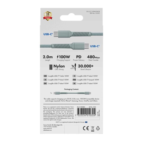 Kablarna har USB2.0-standard och finns som USB-A -> USB-C (60W) och USB-C -> USB-C (100W) i 4 olika längder: 0,5m, 1m, 2m och 3m.