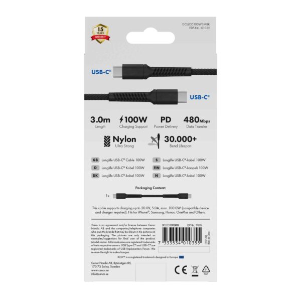 Kablarna har USB2.0-standard och finns som USB-A -> USB-C (60W) och USB-C -> USB-C (100W) i 4 olika längder: 0,5m, 1m, 2m och 3m.