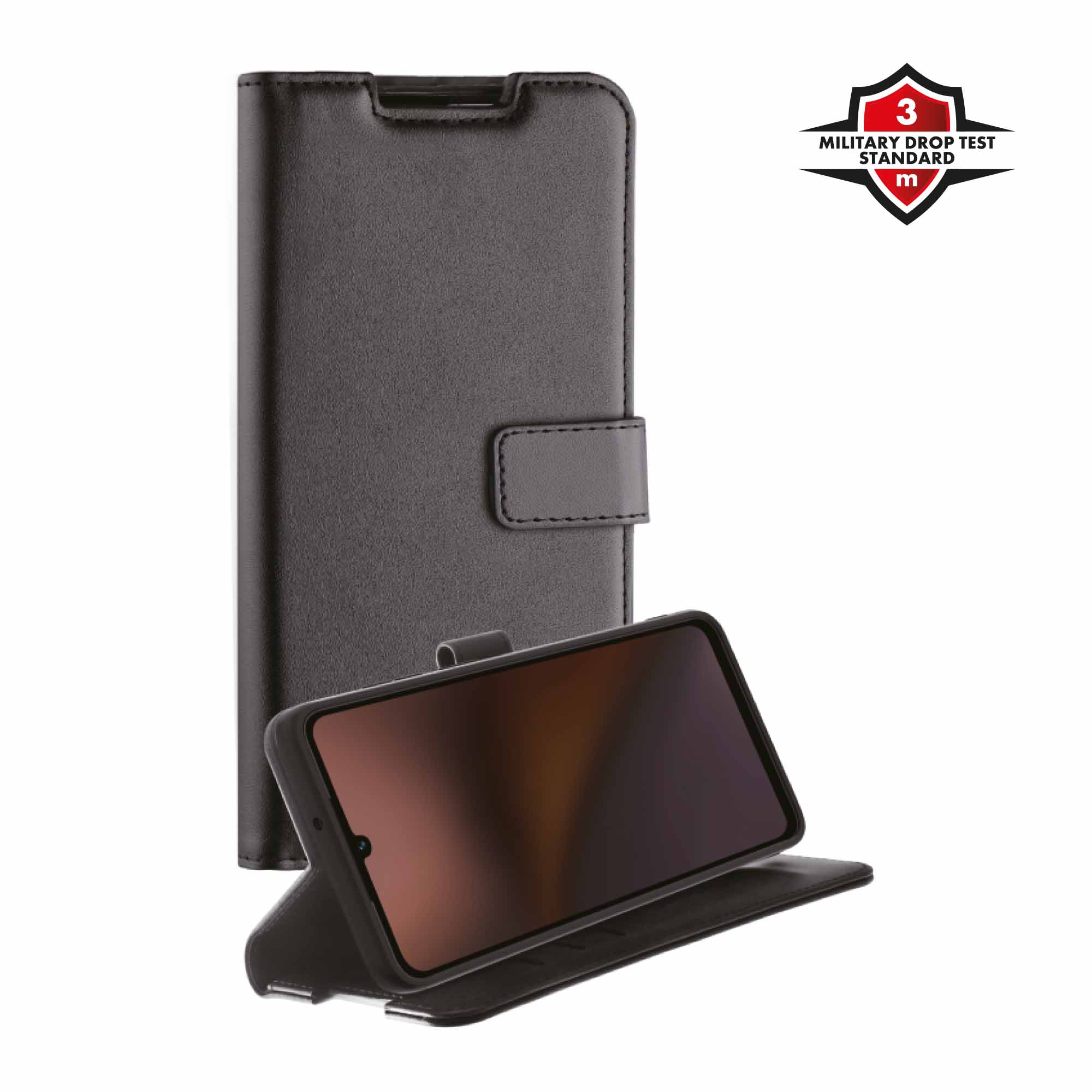 Detta skyddande fodral har tre kreditkortsfack och en stativfunktion för optimal användning i liggande läge. Det skyddar din enhet mot stötar, repor samt fall upp till 3 meter i enlighet med MIL-STD801G-516.7. Det eleganta PU-lädermaterialet har en högkvalitativ känsla och utseende. Den perfekta passformen gör att alla portar och anslutningar är fullt tillgängliga.