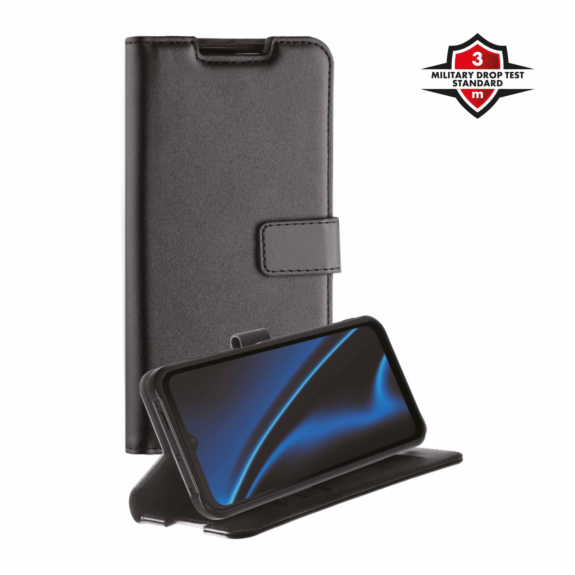 Detta skyddande fodral har tre kreditkortsfack och en stativfunktion för optimal användning i liggande läge. Det skyddar din enhet mot stötar, repor samt fall upp till 3 meter i enlighet med MIL-STD801G-516.7. Det eleganta PU-lädermaterialet har en högkvalitativ känsla och utseende. Den perfekta passformen gör att alla portar och anslutningar är fullt tillgängliga.