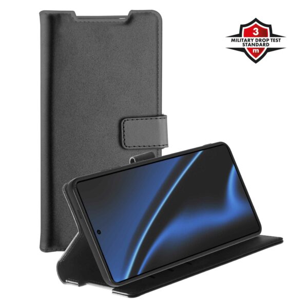 Detta skyddande fodral har tre kreditkortsfack och en stativfunktion för optimal användning i liggande läge. Det skyddar din enhet mot stötar, repor samt fall upp till 3 meter i enlighet med MIL-STD810G-516.7. Det eleganta PU-lädermaterialet har en högkvalitativ känsla och utseende. Den perfekta passformen gör att alla portar och anslutningar är fullt tillgängliga.