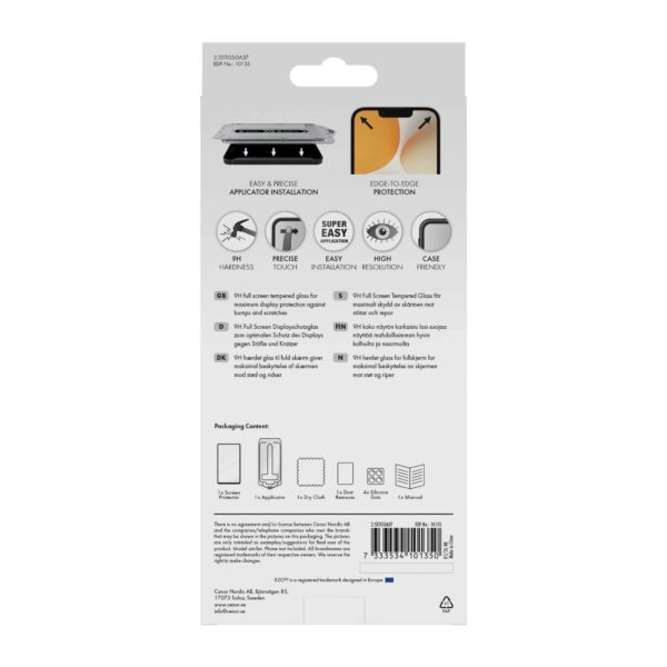 Skärmskyddet är tillverkat av 0,33 mm förstärkt 9H-glas och täcker hela skärmen, inklusive de rundade kanterna. Den medföljande monteringsramen säkerställer snabb och precis installation utan damm eller bubblor.