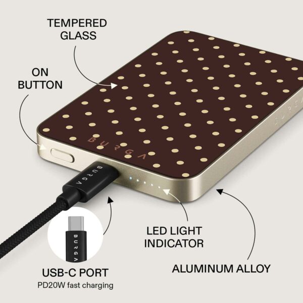 Möt den perfekta blandningen av mode och funktion. Detta eleganta kraftpaket på 5000 mAh håller dina enheter laddade och ger en touch av stil med BURGAs unika, blekningssäkra design. Det är mer än bara en powerbank; det är en statement piece som ger dina enheter ström när som helst, var som helst.