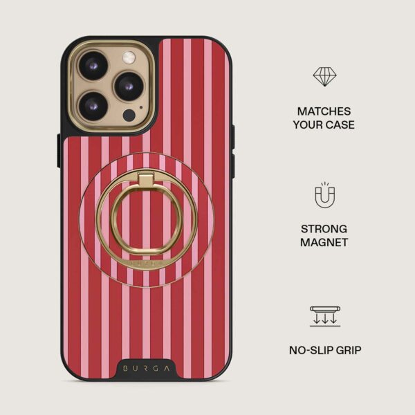 Den här magnetiska mobilringen fäster med ett härligt klick – utan klister, utan krångel. Håll i den när du vill scrolla med en hand, använd den som ett praktiskt stativ när du vill titta handsfree eller som en snygg accessoar som passar perfekt till ditt BURGA-skal.