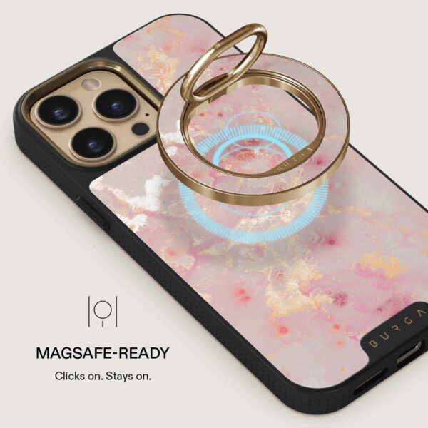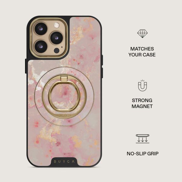 Den här magnetiska mobilringen fäster med ett härligt klick – utan klister, utan krångel. Håll i den när du vill scrolla med en hand, använd den som ett praktiskt stativ när du vill titta handsfree eller som en snygg accessoar som passar perfekt till ditt BURGA-skal.