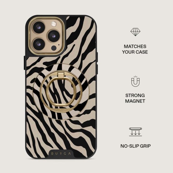 Den här magnetiska mobilringen fäster med ett härligt klick – utan klister, utan krångel. Håll i den när du vill scrolla med en hand, använd den som ett praktiskt stativ när du vill titta handsfree eller som en snygg accessoar som passar perfekt till ditt BURGA-skal.