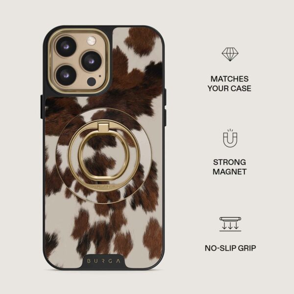 Den här magnetiska mobilringen fäster med ett härligt klick – utan klister, utan krångel. Håll i den när du vill scrolla med en hand, använd den som ett praktiskt stativ när du vill titta handsfree eller som en snygg accessoar som passar perfekt till ditt BURGA-skal.