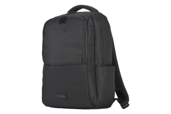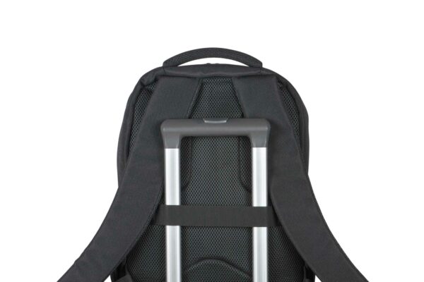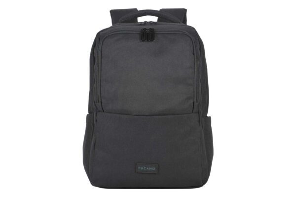 Praktisk och slitstark ryggsäck tillverkad av tyg som framställts av återvunnen plast. Ryggsäcken har ett vadderat innerfack för laptop eller surfplatta, sidfickor för flaskor och paraplyer samt vadderade, justerbara axelremmar. Den har ett rymligt extrafack framtill med dragkedja, perfekt för att organisera extra tillbehör och dokument.