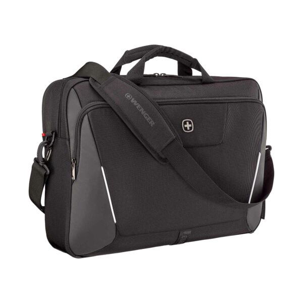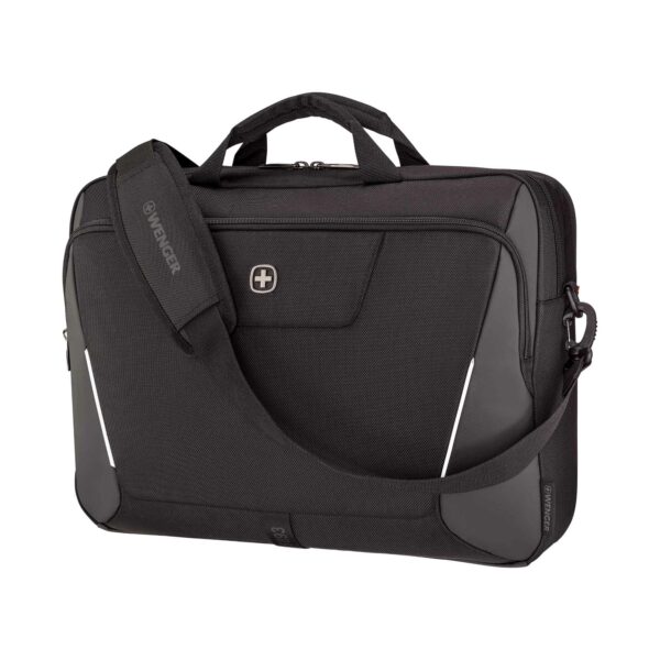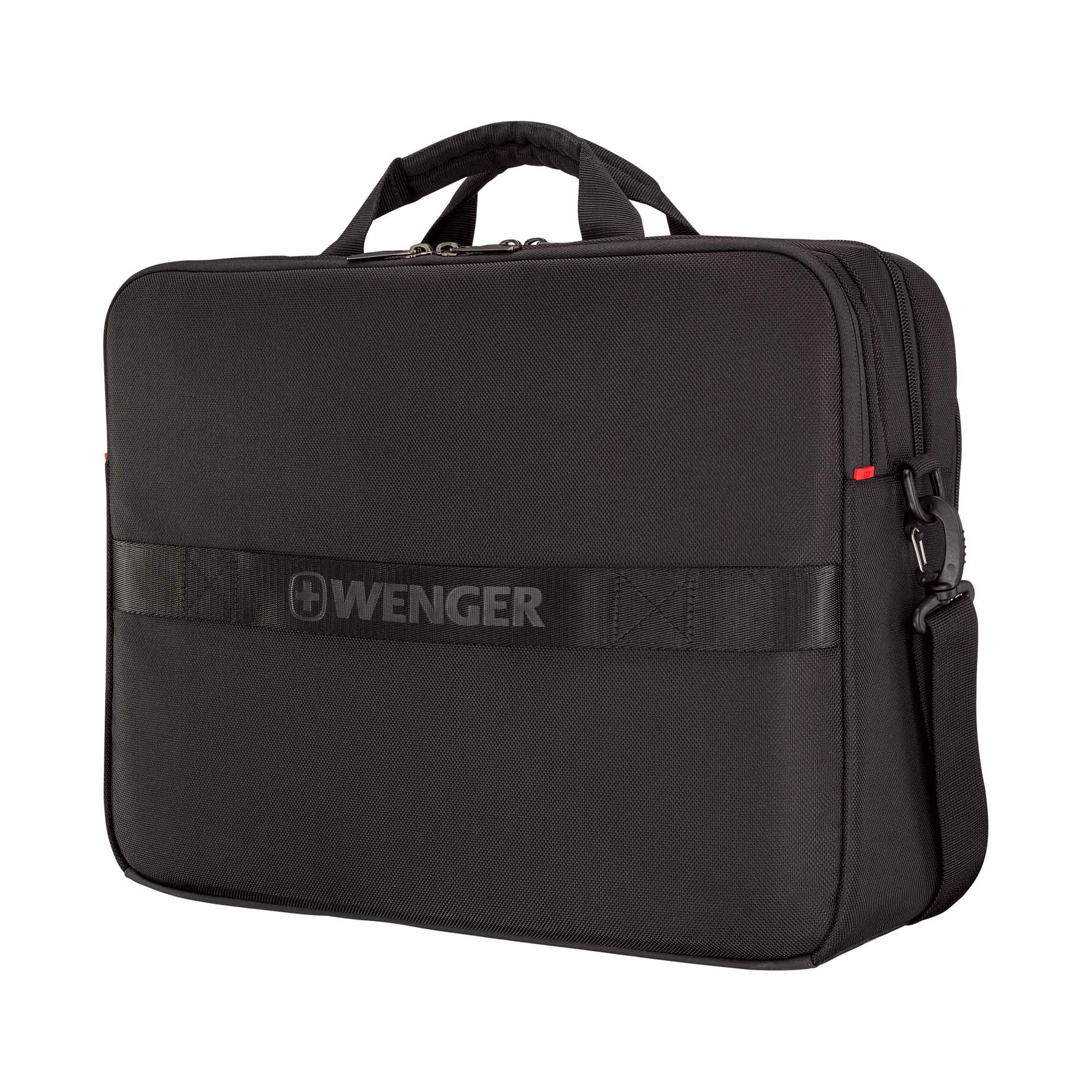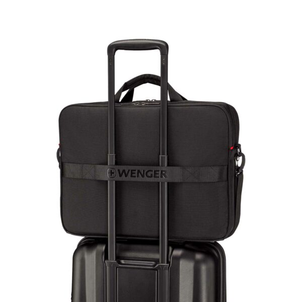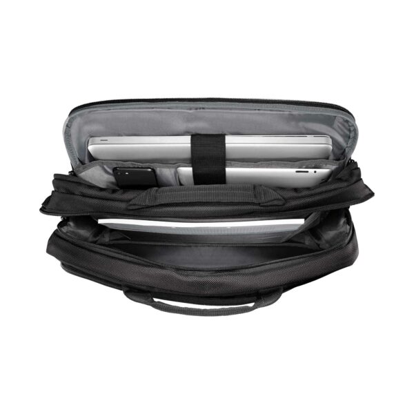 Insidan är utrustad med en fildelare och en förvaringsficka för mindre föremål. Med hjälp av remmen kan du fästa portföljen säkert på ditt bagage, medan den avtagbara axelremmen och de dubbla handtagen ger bekväma bäralternativ.