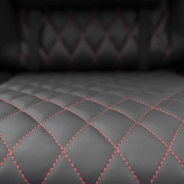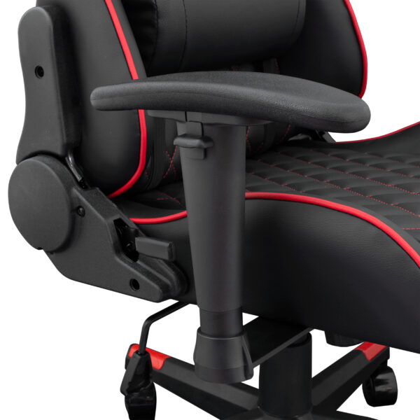 Med 2D-armstöd, 180° lutning och huvud-/ryggkuddar är den utformad för ultimat komfort. Det eleganta svarta och röda PU-överdraget ger stil, medan den robusta metallramen garanterar hållbarhet.