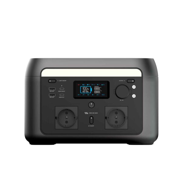 Den intelligenta displayen visar exakt hur mycket energi 600W Power Station har kvar. Den visar batteriprocent, uteffekt till anslutna enheter och hur lång tid det tar att ladda. Dessutom får du meddelanden om för höga eller för låga temperaturer och fläktens status. En fullständig översikt över dessa finns i manualen.