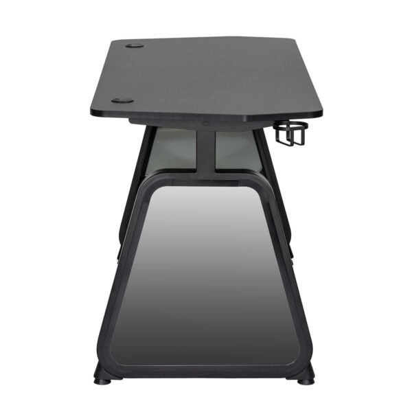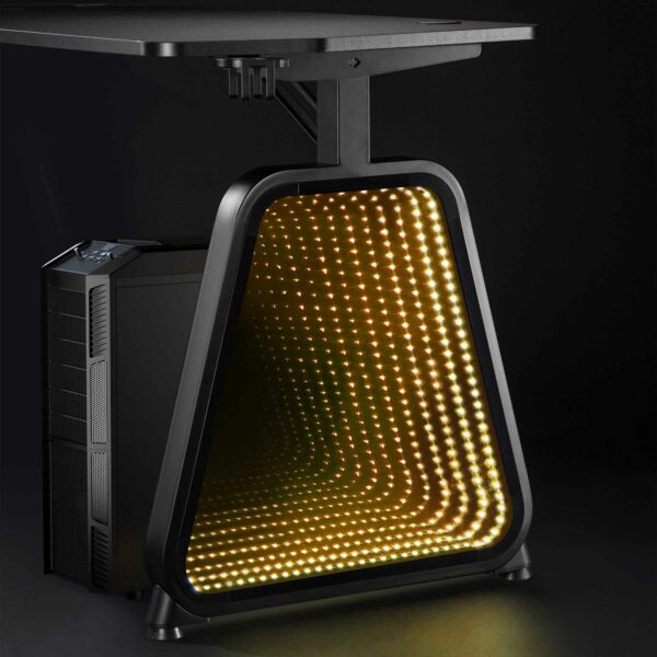 Gör dig redo för episka strider. Tillverkat av spånskiva, stål och härdat glas, är det lika robust som elegant i svart. Den inbyggda ”infinity” RGB LED-belysningen drivs av USB 5V/2A och skapar stämning. Det rymmer även ditt headset och håller dina drycker inom räckhåll. Med en lastkapacitet på 75 kg och mått på 1360x600x750 mm kan du erövra spelvärlden med stil.