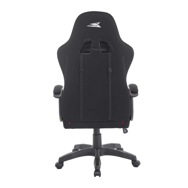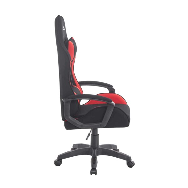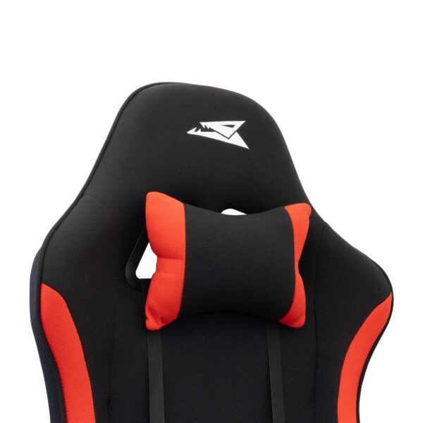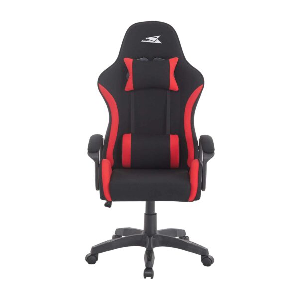 Den har mjuk textilklädsel och stödjande huvud- och ryggkuddar och är gjord för långa spelsessioner eller produktiva arbetsdagar. Den robusta konstruktionen och den djärva röda och svarta designen ger både stil och funktionalitet till din arbetsplats.